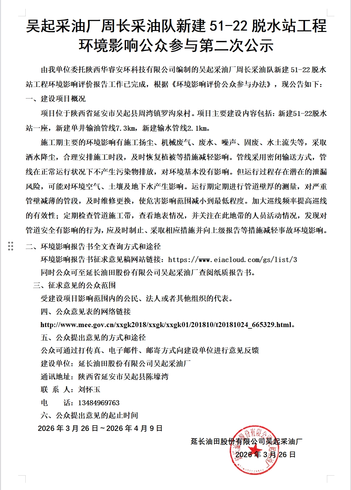 吳起采油廠周長采油隊新建51-22脫水站工程環(huán)境影響公眾參與第二次公示